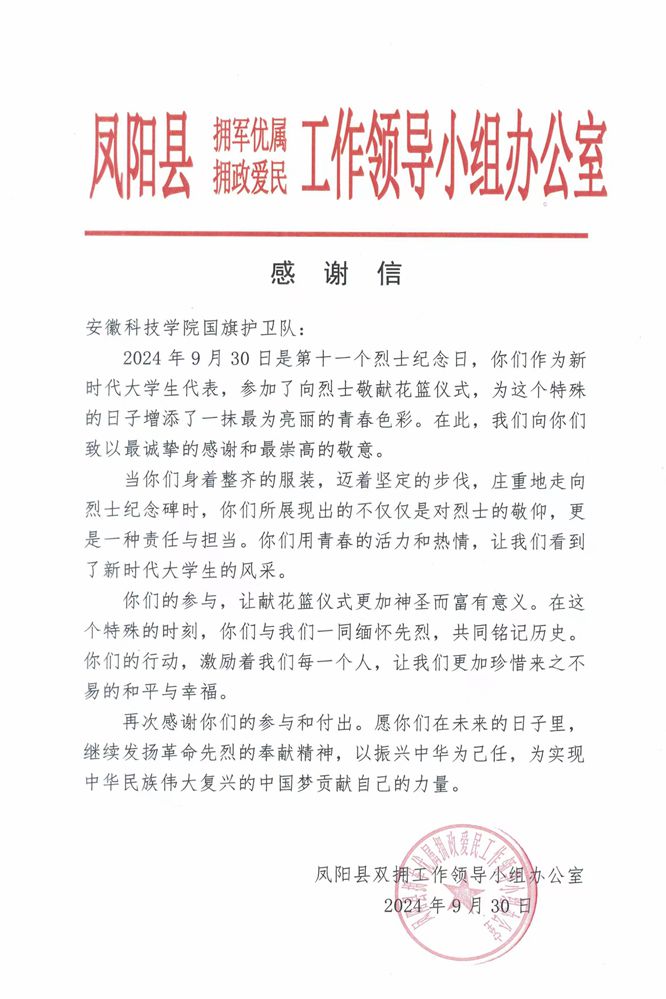 9月30日,我校国旗护卫队收到来自凤阳县双拥工作领导小组办公室发来的感谢信。信中,对我校国旗护卫队在向烈士敬献花篮仪式中的参与和付出表示感谢,对护卫队队员们的出色表现和优良品格给予高度赞扬。